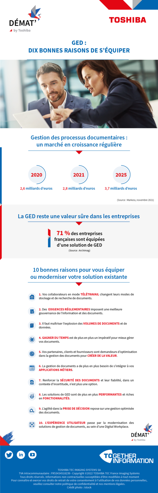 Aujourd’hui, le marché de la gestion électronique de documents représente 2,8 milliards d’euros (en 2021) avec une croissance de +5,6 %, d’après Markess.[2], Ils anticipent, d’ici à 2025, une évolution du marché qui devrait avec une croissance moyenne attendue à 7% : « Les besoins autour de la poursuite de l’activité à distance, les besoins d’accélération autour de la dématérialisation de bout en bout, comme ceux de l’automatisation des processus métiers, porteront le marché de la gestion électronique de documents. »